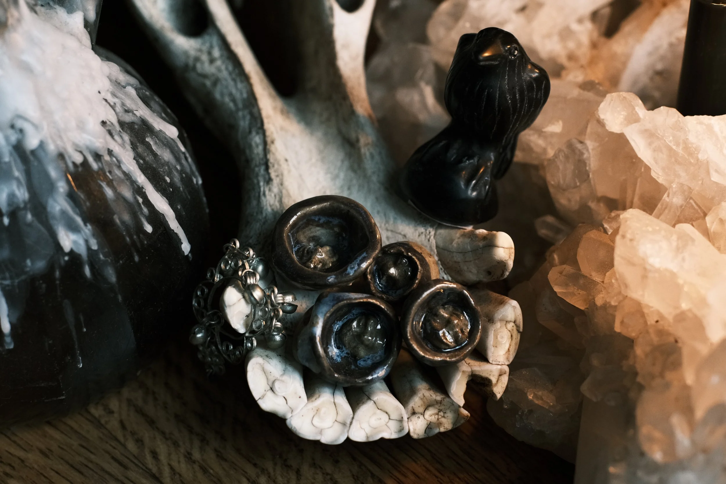 Through my ceramic work and fiber arts, I create spiritual tools—ritual vessels, altar pieces, charms, and spell bags—infused with intention to support self-discovery and healing.